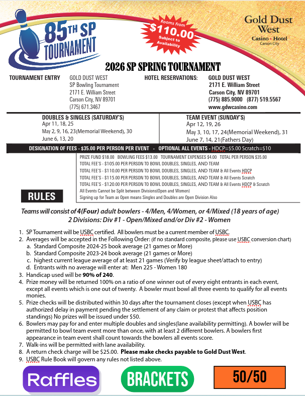Step up, roll hard, and make your mark at Gold Dust West in Carson City! The Spring 85th SP Bowling Tournament is back, bringing together bowlers of every skill level for an action-packed weekend of strikes, spares, and nonstop excitement. Whether you’re chasing glory, smashing your personal best, or just here for the thrill, this is the ultimate bowling showdown you won’t want to miss.